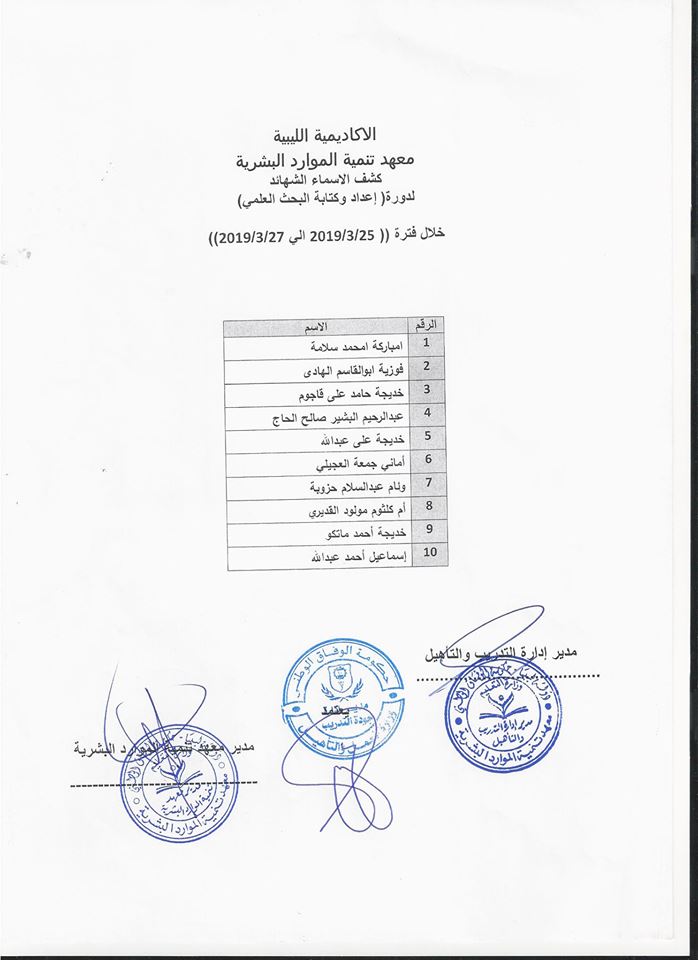 اعلان هام يطلب من السادة متدربين معهد تنمية الموارد البشرية بالاكاديمية الليبية الحضور يوم الثلاثاء الموافق 2019/6/25 علي تمام الساعة 11:00 صباحاً لاستلام الشهادة كل حسب الدورة الملتحق بها . هذا للعلم